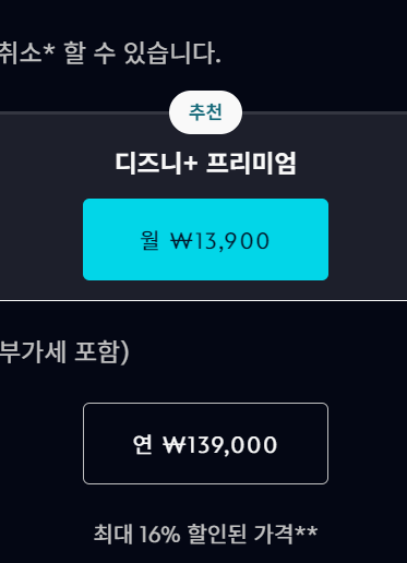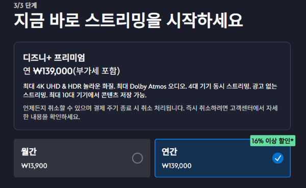 디즈니플러스 프리미엄의 경우 연간으로 결제하면 16%를 할인 받을 수 있으며, 27,800원을 아낄 수 있네요.